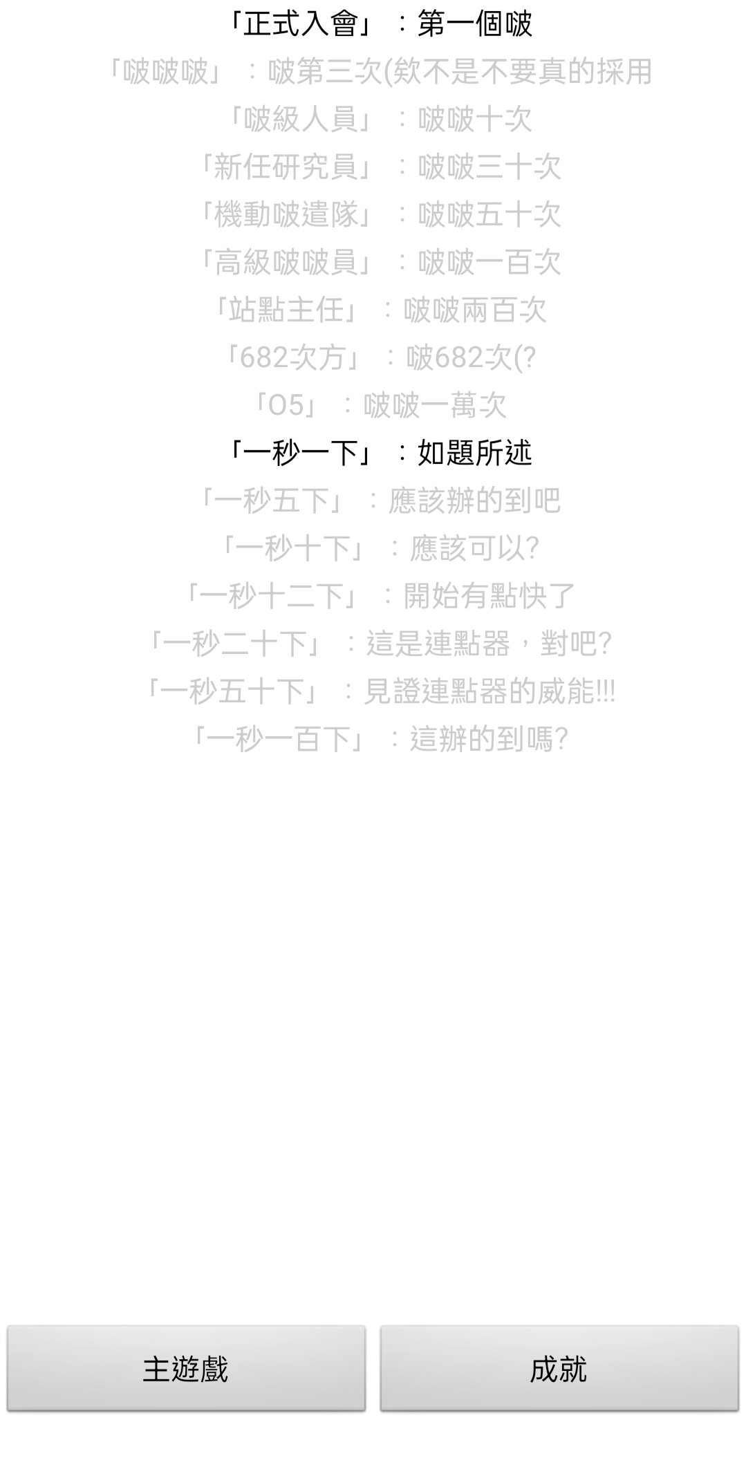 此作品是一個可聯網的手機點擊遊戲,有著極低的遊戲性,還有一些幾乎不太可能達到的成就。以MIT App Inventor2 編寫,這同時也是Google Play說無法辨識開發人員的原因。